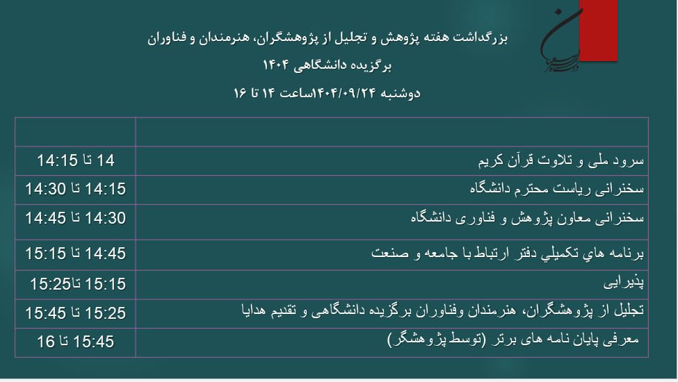 توفیق تلاش در میدان پژوهش و نوآوری، فرصت ارزشمندی است که استفاده نیکو از آن به دست اندیشمندان فرهیخته میسر خواهد شد و تقدیر از تلاشگران برگزیده این امر را سزاوار است. به این منظور نشستی در تاریخ دوشنبه 24 آذرماه 1404ساعت 14 تا 16در سالن آمفی تئاتر توحیدخانه برگزار می‌گردد. افتخار حضور شما استادان، دانشجویان و کارمندان گرامی، محفل‌مان را مزین خواهد نمود